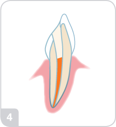 Den tomma pulpakanalen fylls med guttaperka och tanden försluts med fyllning.