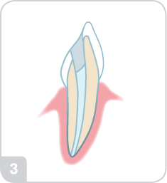 Den tomma pulpakanalen fylls med guttaperka och tanden försluts med fyllning.